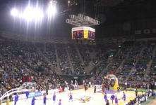 ←チケットは完売し当日販売無しの大盛況。NBAなみの、天井からつるした大迫力の得点掲示板でした。